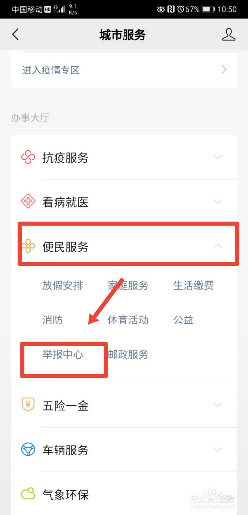 进入到城市办事后,找到便民办事,然后再点击进入该功能下的举报中间;