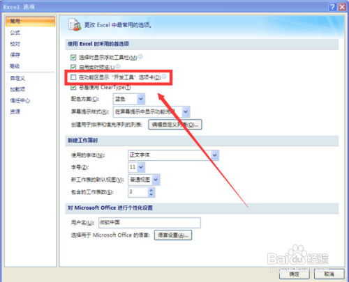 在【常用】栏右边,找到【在功能区显示“开辟东西”选项卡】并点击勾选