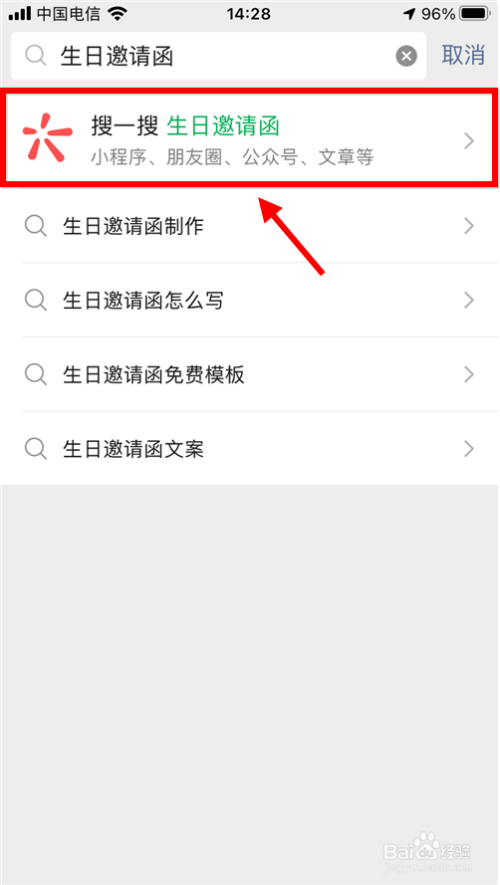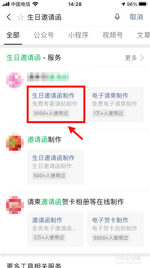 然后在搜索框输入“生日宴邀请函”,查找小程序。