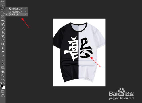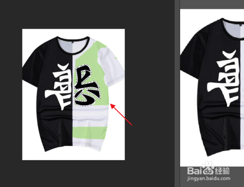 导入衣服图片素材之后,利用魔棒的东西,按着shift键拔取要去除的文字。