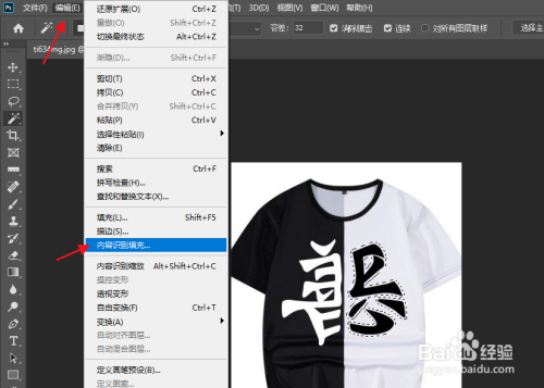 1.导入衣服图片素材之后,利用魔棒的东西,按着shift键拔取要去除的文字。