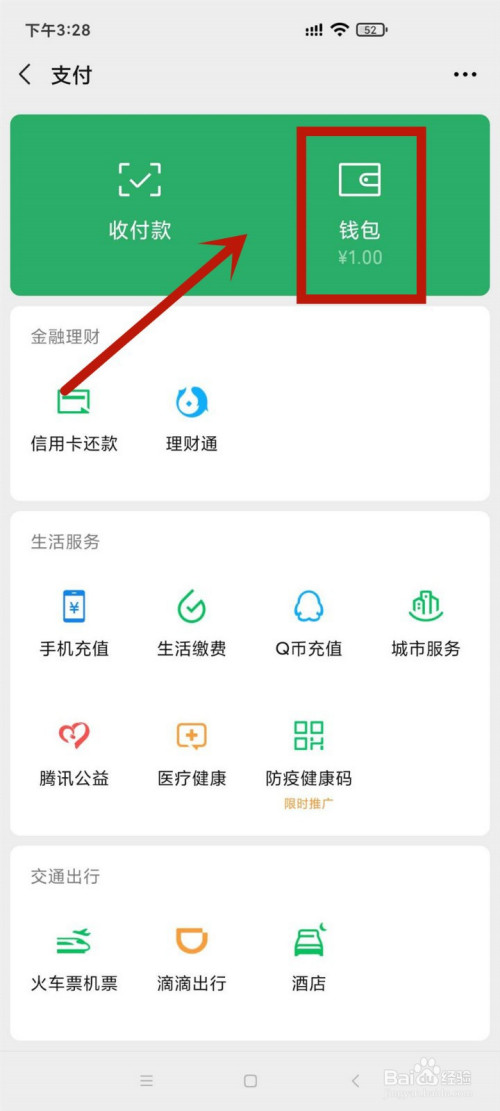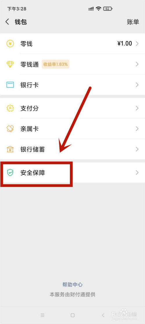 2.点击支付,再点击钱包,进入最下方的平安保障。