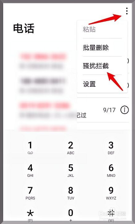 首先进入德律风的本家儿页面中,点击更多选项。然后点击骚扰阻挡。