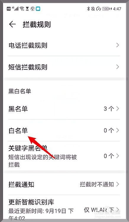 在阻挡法则的本家儿页面中,点击进入白名单选项。
