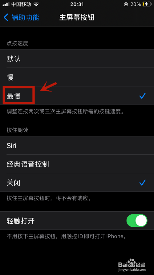 切换选择【最慢】。此时双击或三击的按键速度就会变慢。