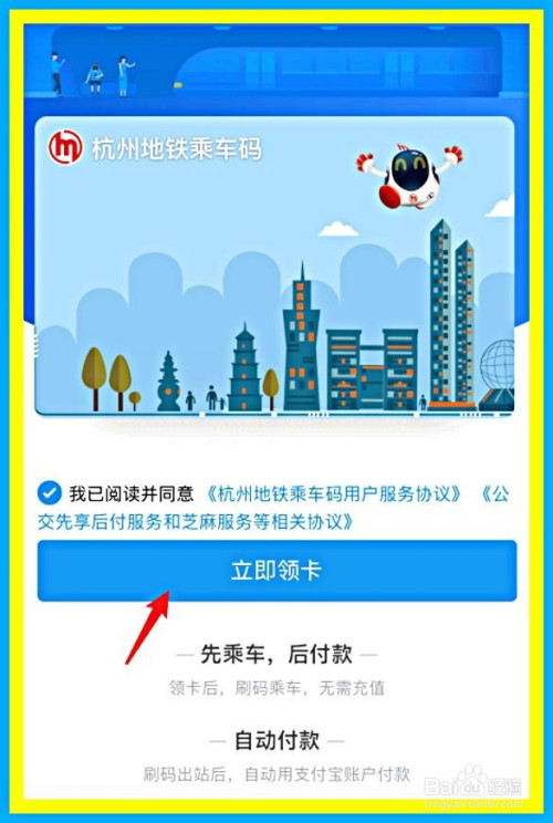 确定后,在杭州地铁搭车码界面,点击当即领卡。