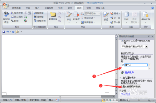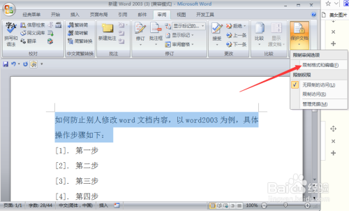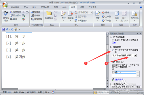 在弹出“限制核阅选项”中选择“限制格局和编纂”,如图所示: