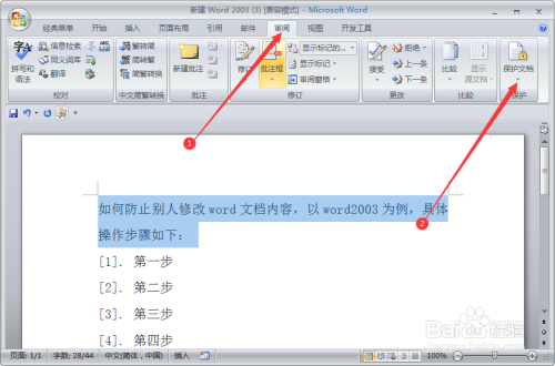 在导航栏点击“核阅”,选择“庇护文档”,如图所示: