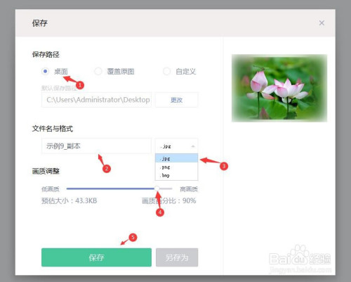 跳出保留操作栏,选择保留路径,定名文件,选择保留格局,调节保留文件大小,确认后点击保留