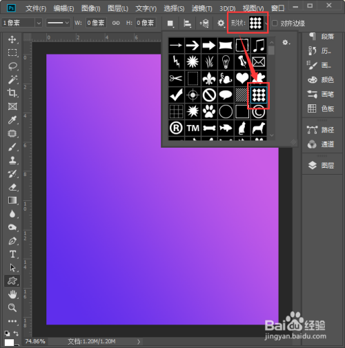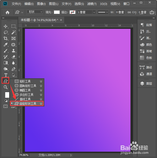 布景填充好渐变颜色之后,我们把前景色设置为【白色】,然后点击【自定外形东西】,如图所示。