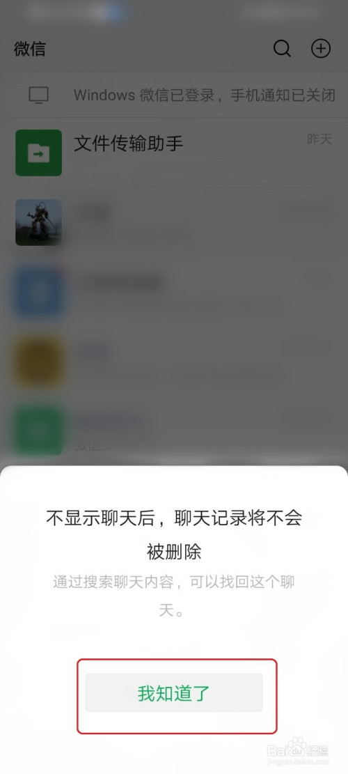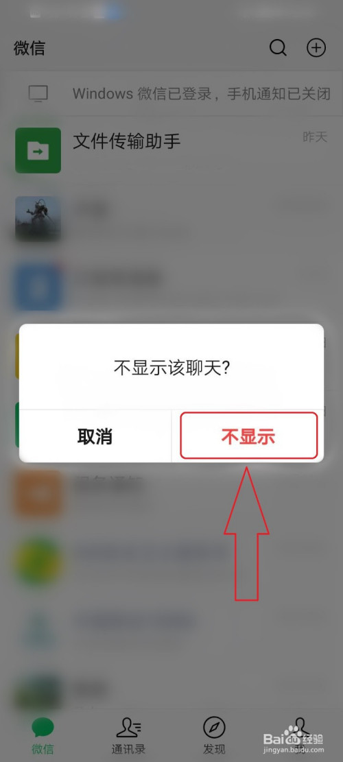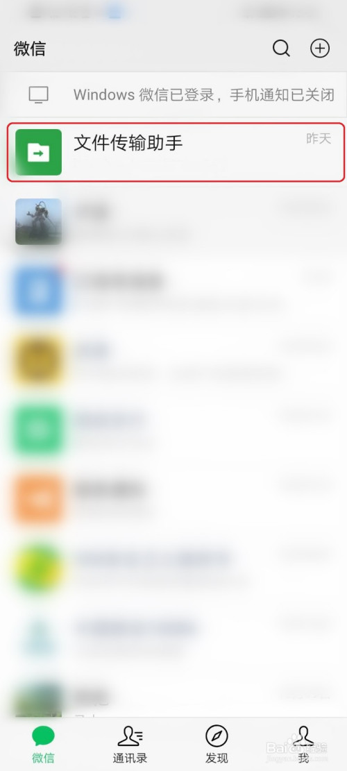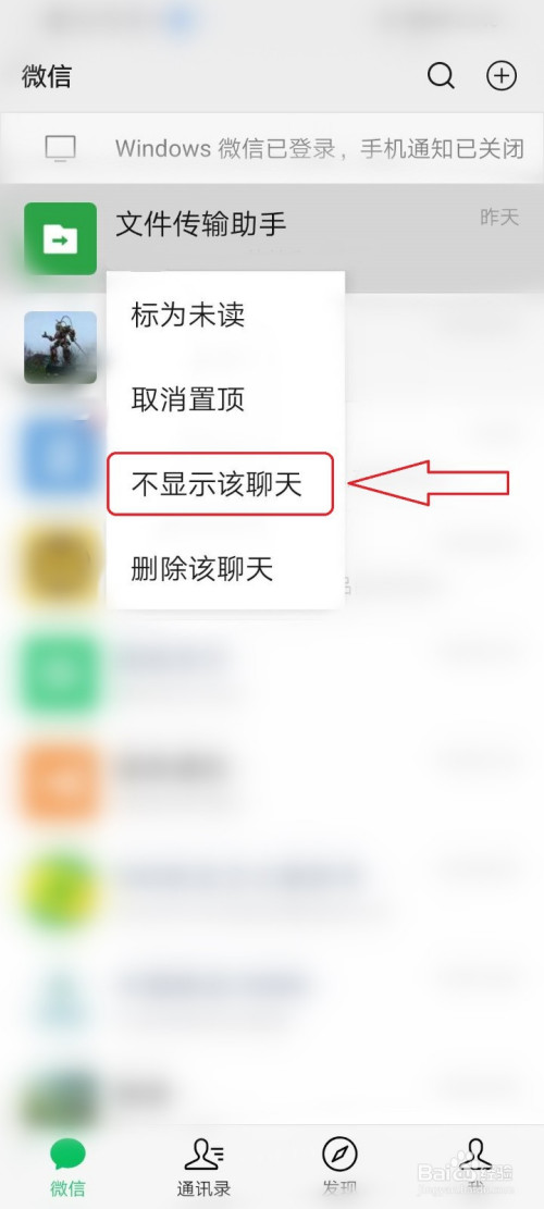 选摘要埋没的聊天记实,例如”文件传输助手“,然后长按。