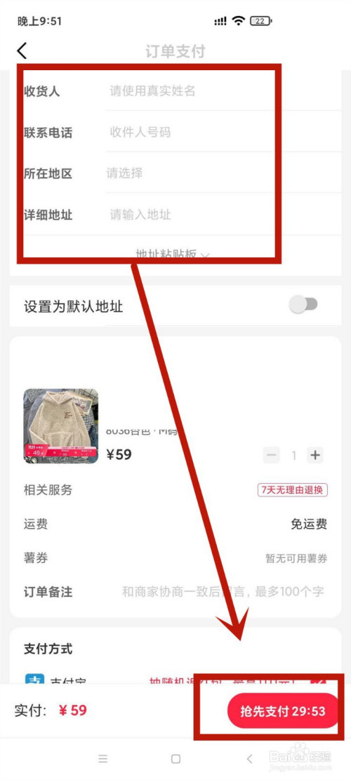 4.编纂上收货地址信息后选择支付体例,点击右下角的争先支付即可。