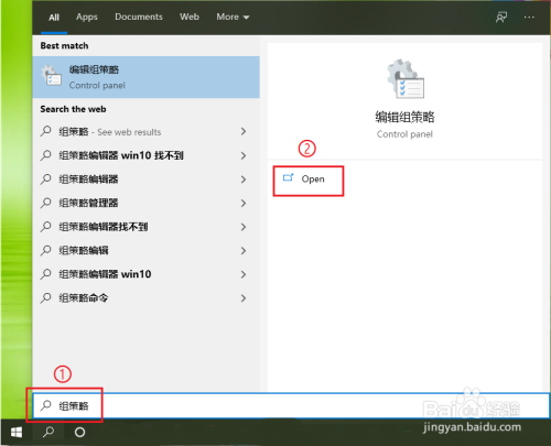点击电脑左下角的搜索框,输入”组策略“,然后点击【Open】。