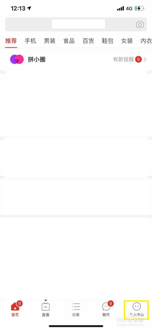 首先进入到拼多多本家儿页面,然后点击进入右下角的小我中间选项。