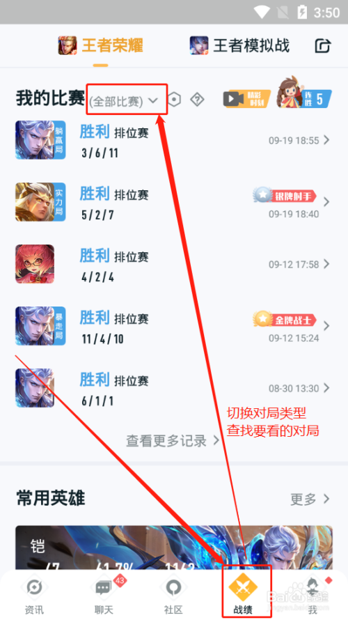 3、下拉“战绩”页面,可以看到对局列表;可以经由过程切换角逐类型,来查找对局,这样可以更快速的找到想要复盘的对局