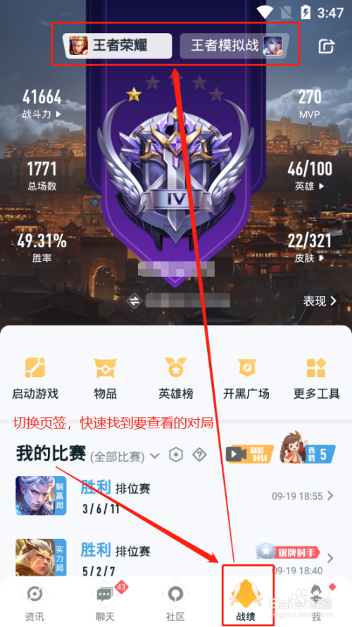 2、将底部导航栏切换到“战绩”;可以在顶部切换页签,选择是王者荣耀角逐对局仍是王者模拟战
