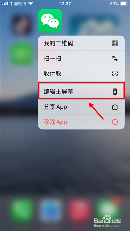 长按后在菜单列表中点击“编纂本家儿屏幕”选项。