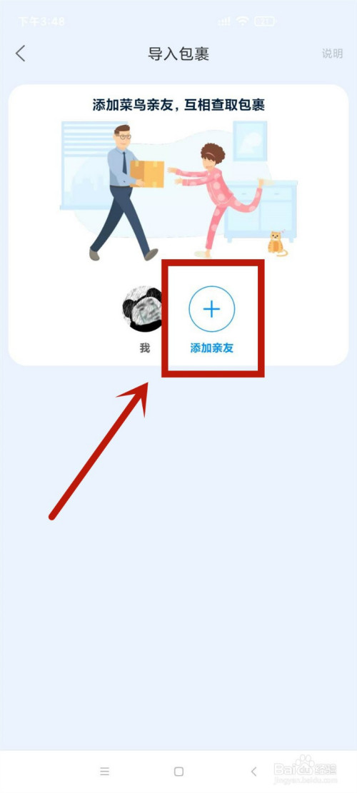 在导入包裹页面,点击 + 添加亲朋选项。