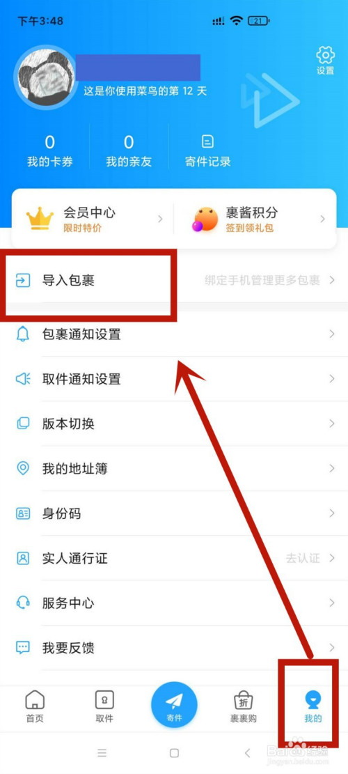 3.若本身有多个手机号的话,可以点击首页右下角的我的,再点击导入包裹。