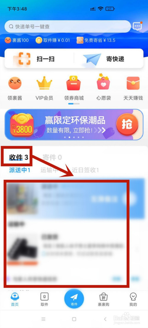 2.若是老友给本身寄件时写的是本机手机号,点击收件,页面就会显示出相关快递物流。