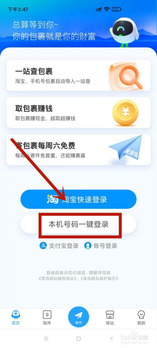 1.打开菜鸟裹裹,点击本机号码一键登录。