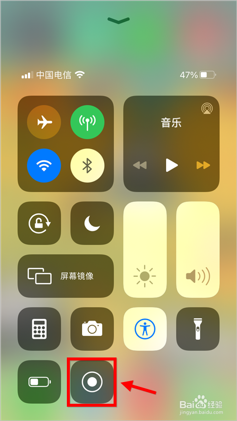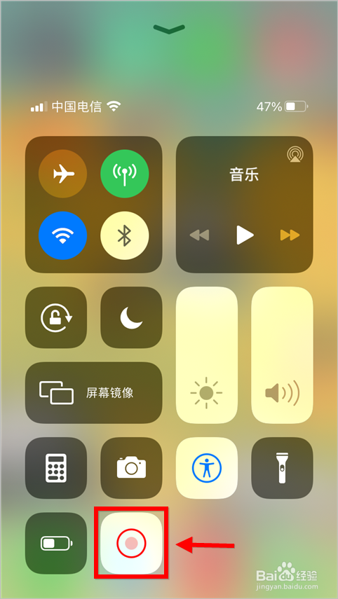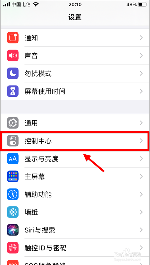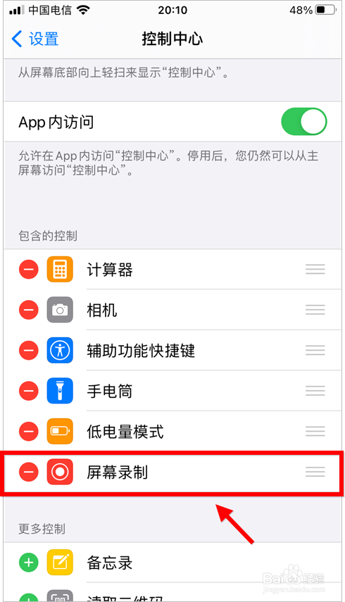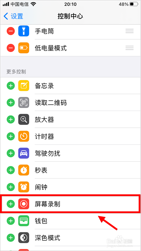 进入节制中间后,找到屏幕录制功能选项,点击绿色+号。
