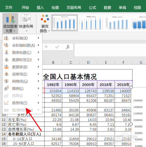 点击“公式”。可以看到趋向线的公式也显示出来了。