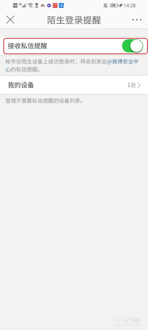 注重:①、点击”接收私信提醒“右侧的开关,即可封闭”目生登录提醒“;