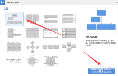 在弹出的智能图形对话框选择合适的组织布局图插入即可。