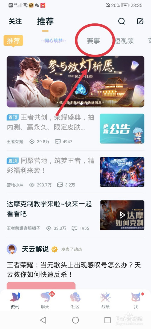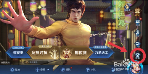 进入游戏界面或营地(在游戏的右下角以及王者营地的置顶栏可看到“赛事”按钮。)