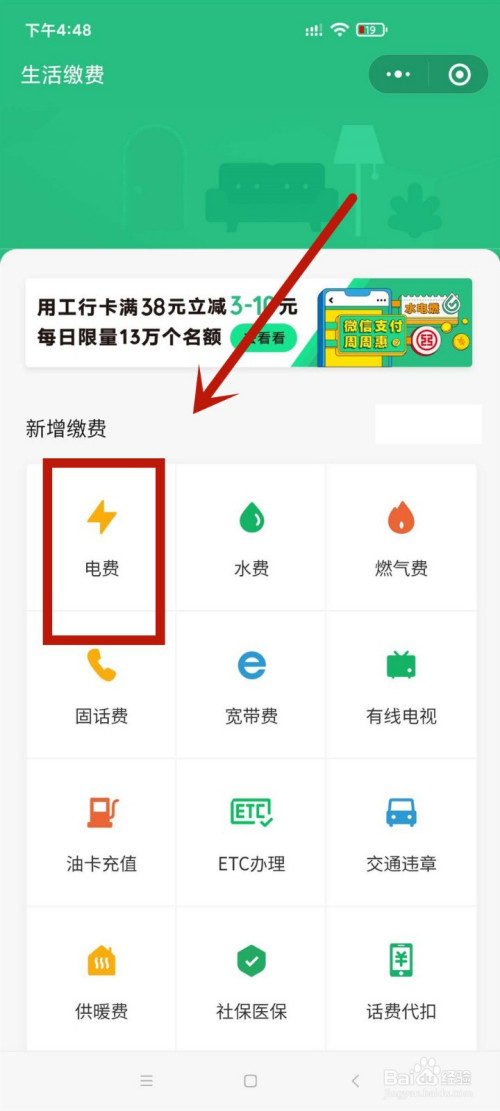 然后点击进入新增缴费下的电费选项。