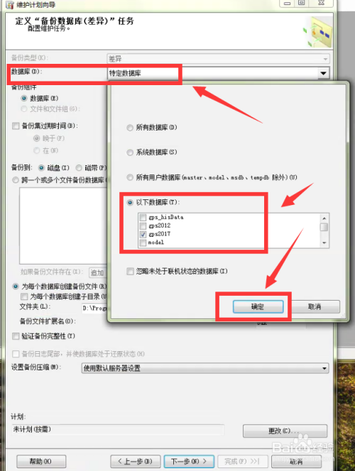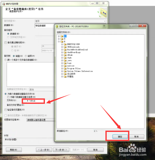 接着界说指定命据库,选定备份文件存放当地磁盘上的位置。