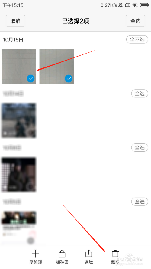 打开相册之后,用手指按住要删除的图片两秒摆布。