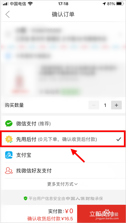 在付条目时点击先用后付,就能0元下单了。