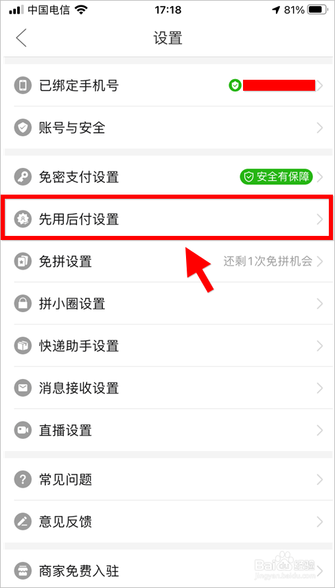 进入小我中间后,发现多出一项先用后付的设置。