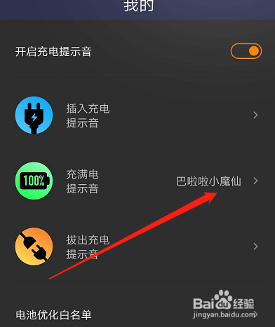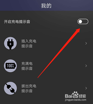 在我的页面,将开启充电提醒音的开关打开。
