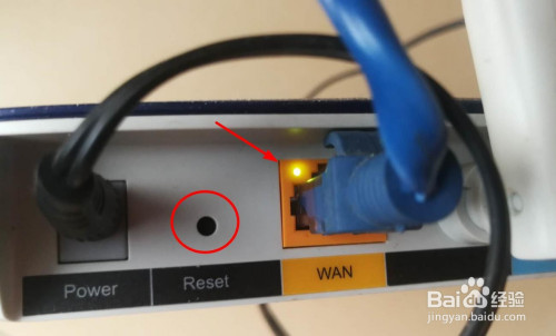 然后找到路由器“Reset”小孔。找出一根小硬针,可以用牙签棍或者棉签棒,放入“Reset”小孔上长按5秒以上。可以看到WAN上的指示灯会熄灭然后重启。路由器就恢复出厂设置了。