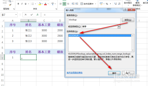 在弹出的查找框中,输入方针函数vlookup,并点击“转到”,最后点击“确定”,具体如图所示: