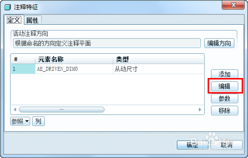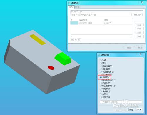 如图所示,添加注释对话框中有良多的注释类型可选,这里我们来标注一个尺寸,选择类型“从动尺寸”,点击确定。