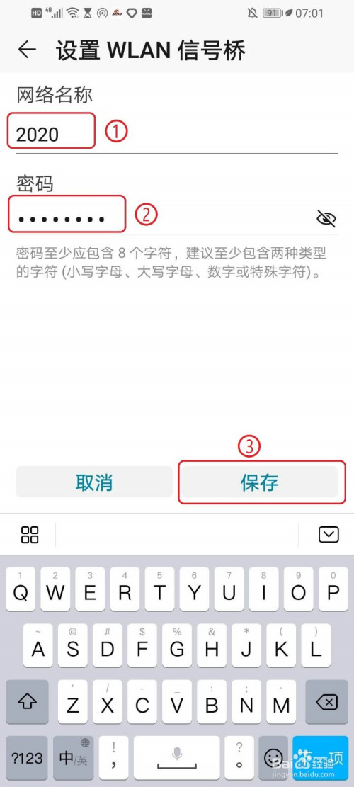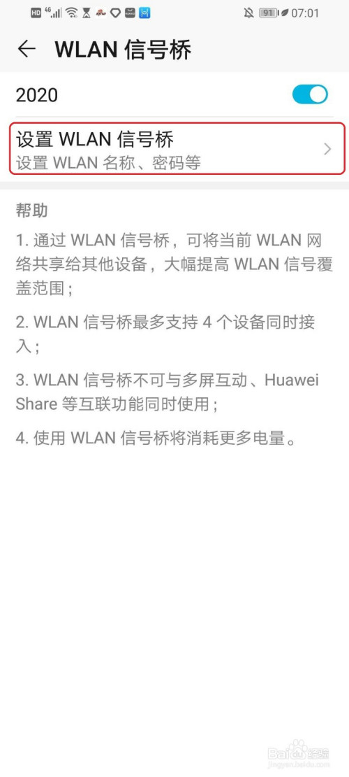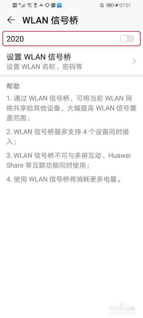 打开“WLAN旌旗灯号桥”,例如点击“2020”右侧的开关。