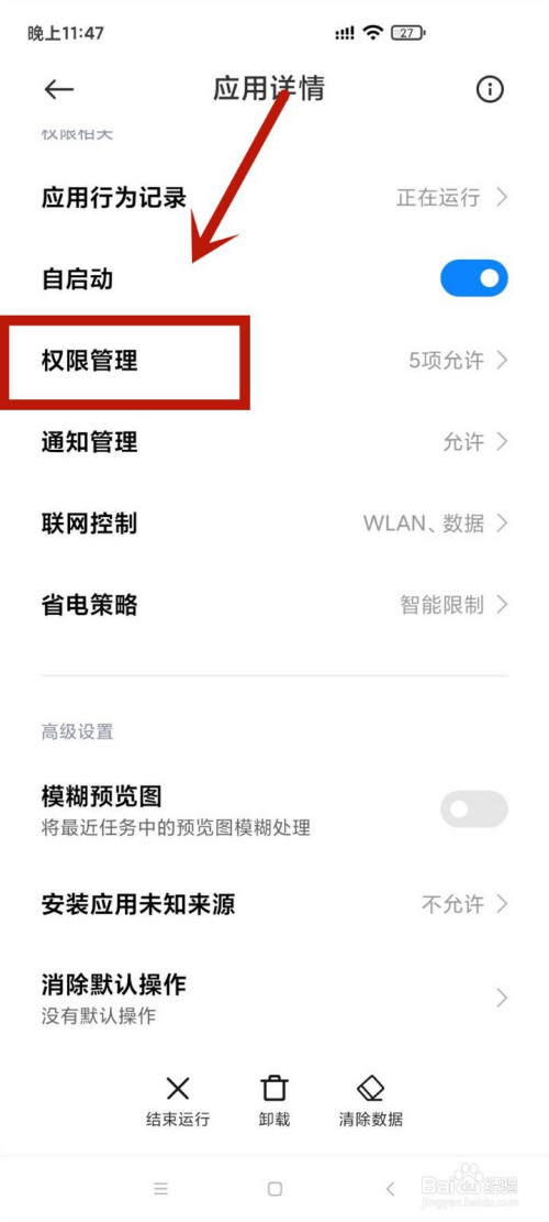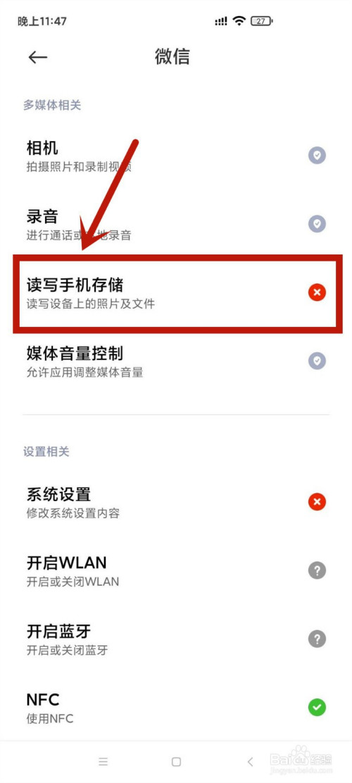 2.点击微信,再点击权限办理进入读写手机存储。