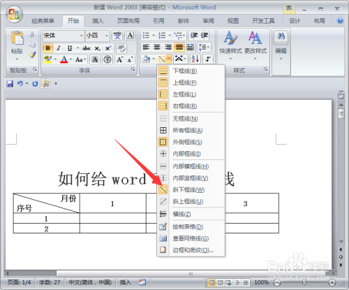 在边框和底纹左上方点击【边框】,点击斜线,选择应用于单位格,点击确定,如图所示: