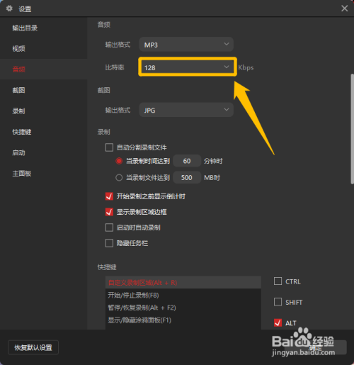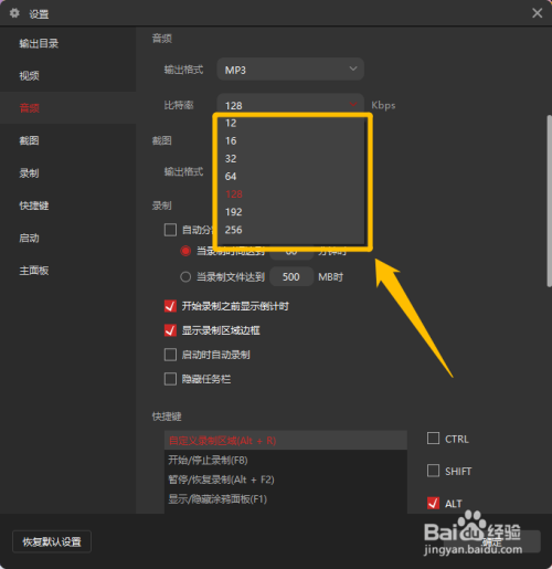 点击“比特率”中的复选框后,在睁开的下拉框中选摘要设置的比特率。
