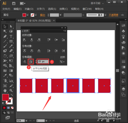 最后,我们把参数调整为【20px】,点击【程度分布间距】,这样每两个图形中的间距都酿成不异的大小了,如图所示。