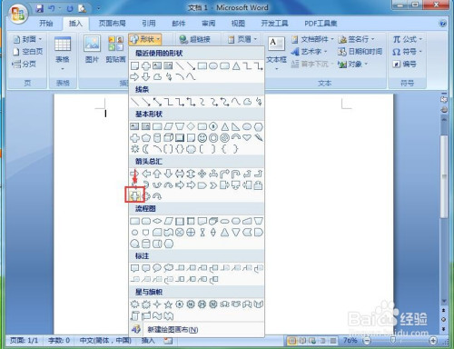 点击插入,选择外形东西,在箭头总汇类别中点击右箭头标注;