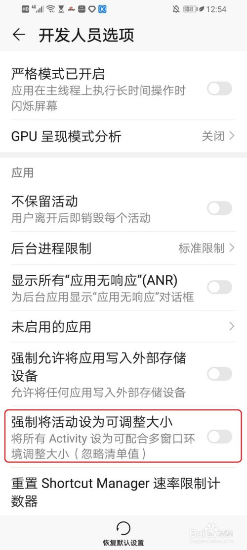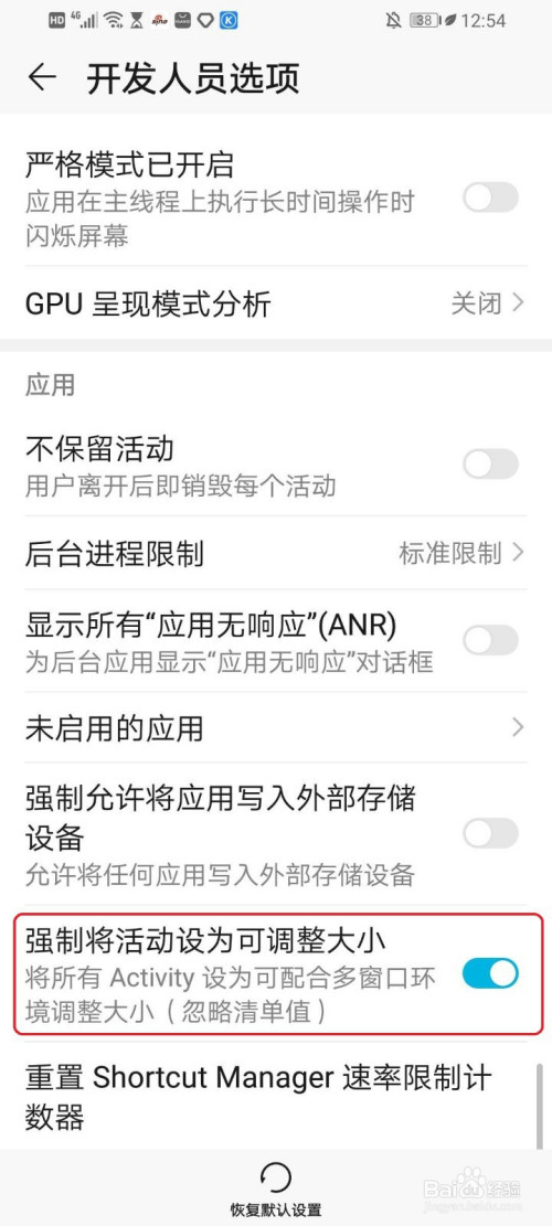 下滑页面到最底端,点击“强制将活动设为可调整大小”右侧的开关。