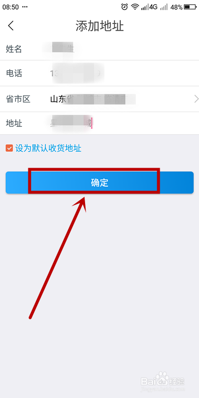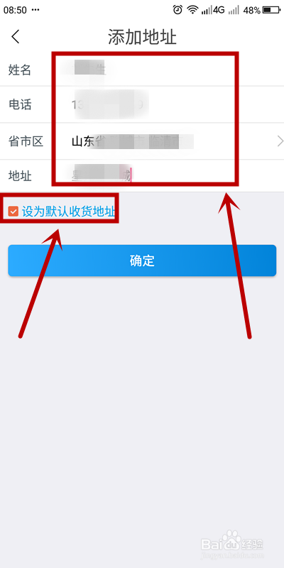进入【新增地址】页面后,输入地址信息,若是有需要请勾选【设为默认收货地址】