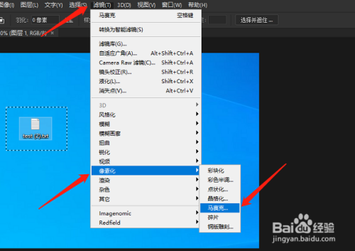然后点击上方东西栏中的滤镜,在弹出的菜单中,选择像素化,然后再选择马赛克。
