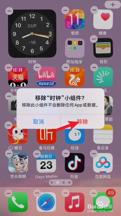 长按后,在弹出提醒内点击【移除小组件】的选项。