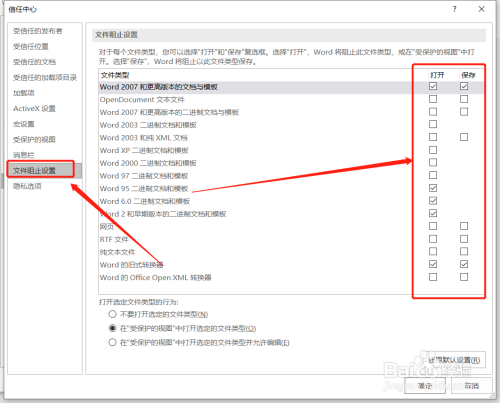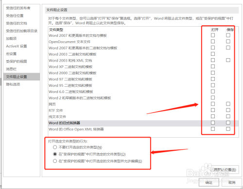 将文件类型下右侧【打开】和【保留】两处的选框去失落勾选【✔】,打开选定文件类型的行为选择【在"受庇护的视图"中打开所选定的文件类型】,点击确定。